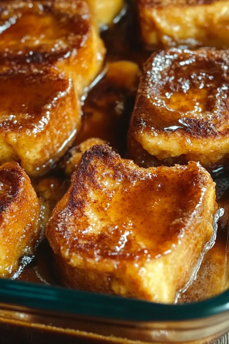 - Assemble and Bake:Pour the caramel mixture over the soaked bread. Bake uncovered for 40 minutes until golden and set.