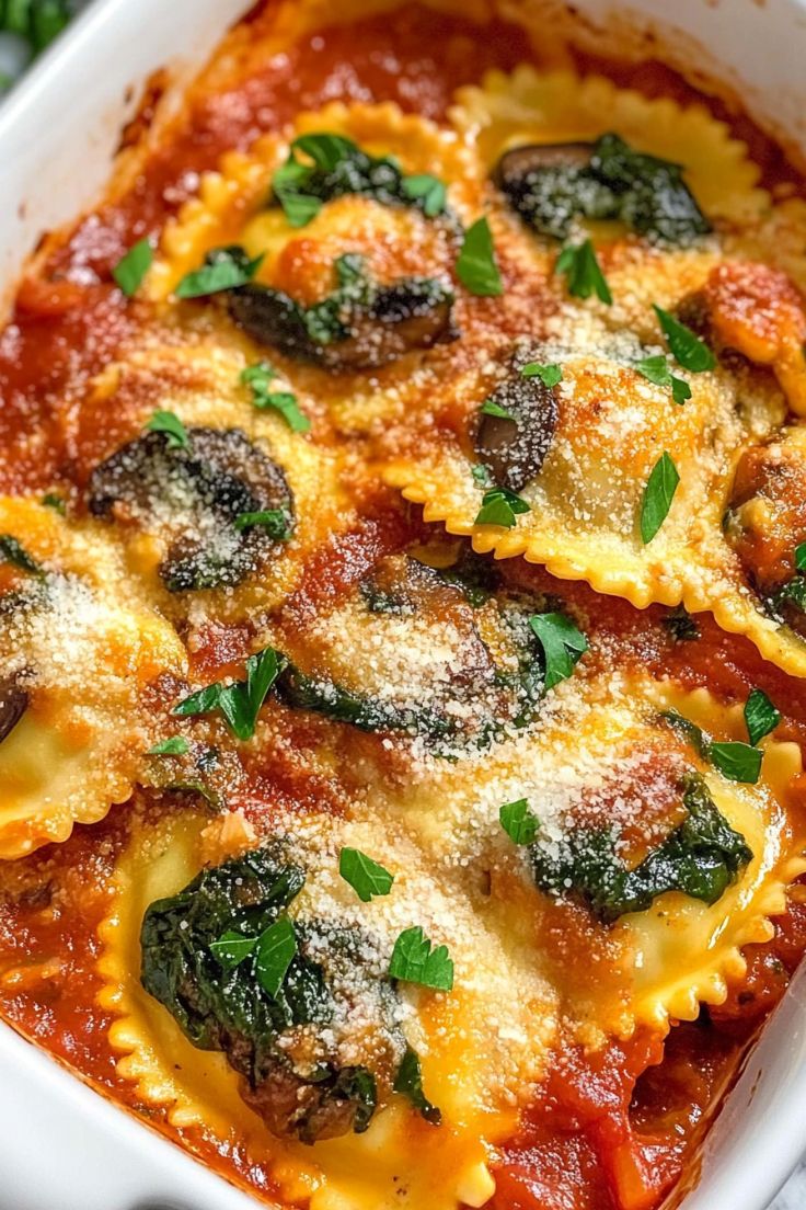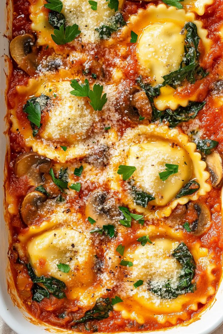 With layers of cheesy ravioli, savory mushrooms, and fresh spinach, topped with melty mozzarella and Parmesan,