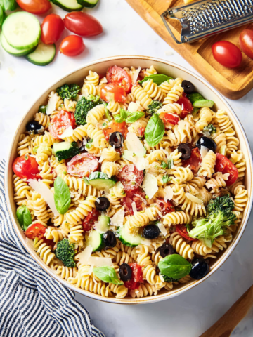 To make this Rainbow Orzo Salad, you’ll need orzo, a handful of crisp vegetables, feta, basil, and a quick homemade dressing. That’s it. Chances are, you already have most of the dressing ingredients in your kitchen. The rest? Just a few fresh vegetables and a box of pasta. It’s almost silly how colorful it looks …