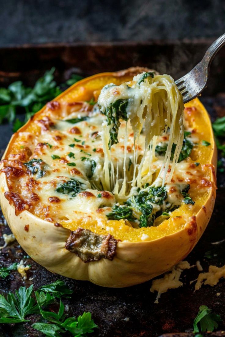 As the squash roasts, the kitchen fills with the warm, savory smell of garlic and Parmesan. The final dish is rich, satisfying, and secretly loaded with spinach.