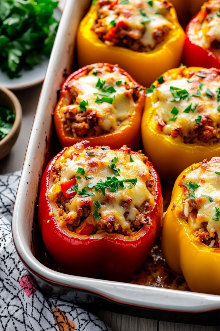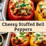These cheesy stuffed bell peppers are filled with a rich, savory mix of seasoned beef, tomato sauce, and tender rice, then topped with melty mozzarella for the ultimate comfort food experience.