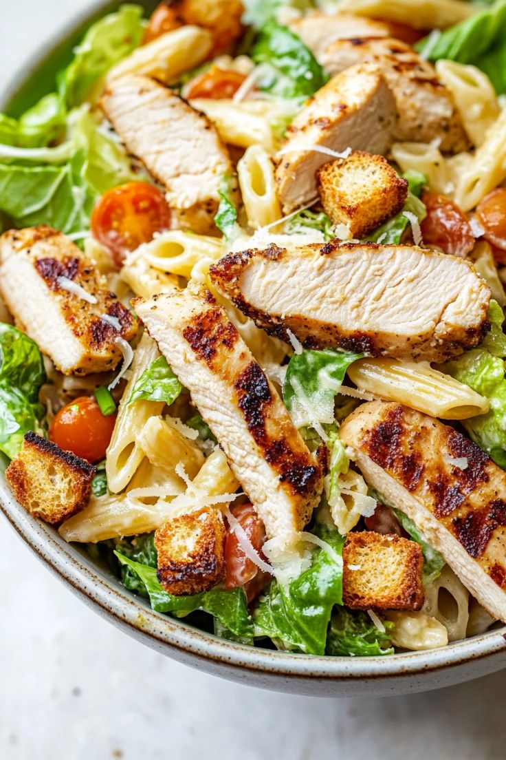 Juicy grilled chicken, crisp romaine, cherry tomatoes, and crunchy croutons meet perfectly cooked pasta, all tossed in a rich, creamy Caesar dressing.