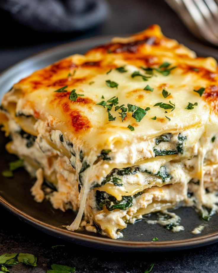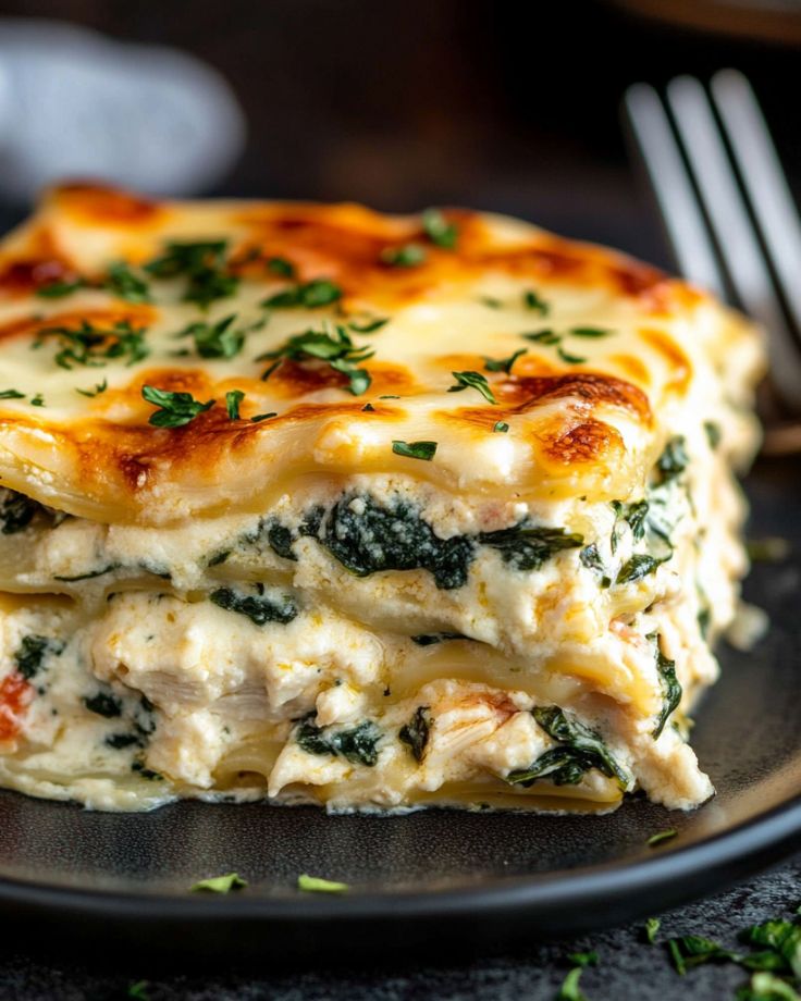 A rich and satisfying white sauce lasagna with layers of tender chicken, creamy spinach sauce, and melted cheese.