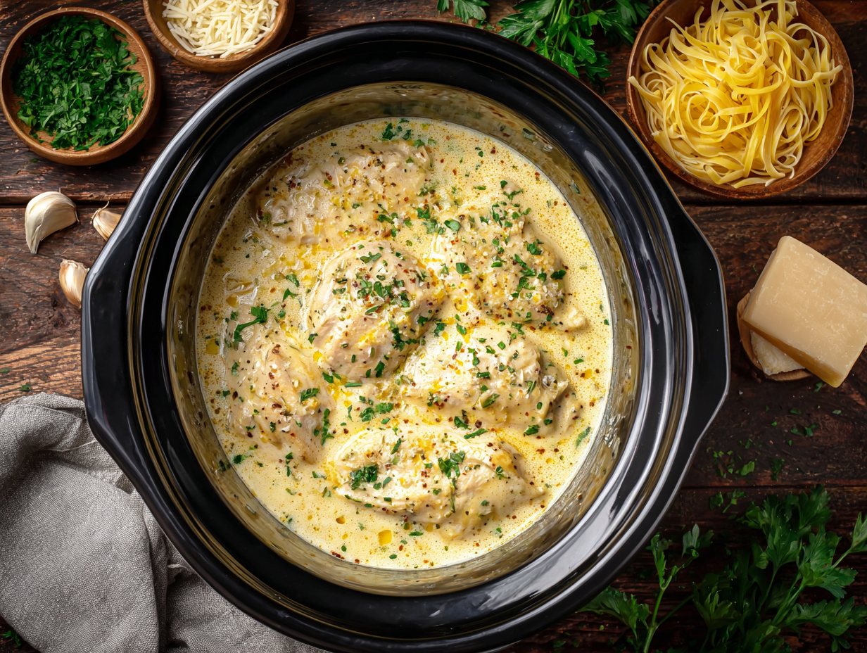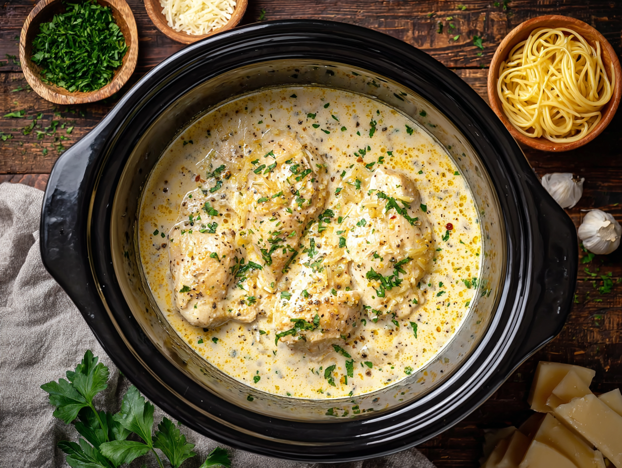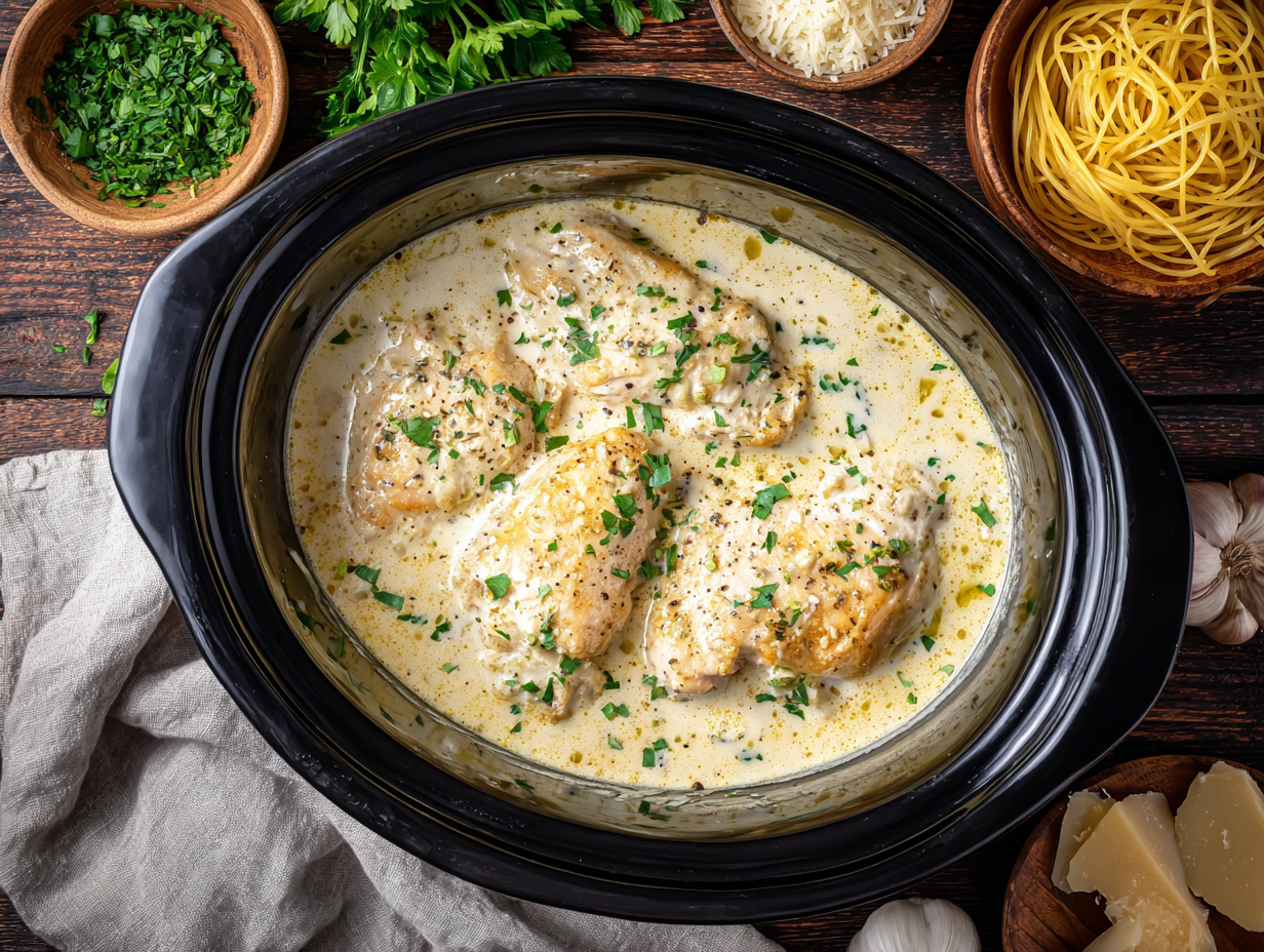 A comforting slow cooker meal featuring juicy chicken breasts simmered in a rich, creamy sauce with Italian-style seasoning. Serve it over delicate angel hair pasta for an easy dinner the whole table will love.