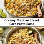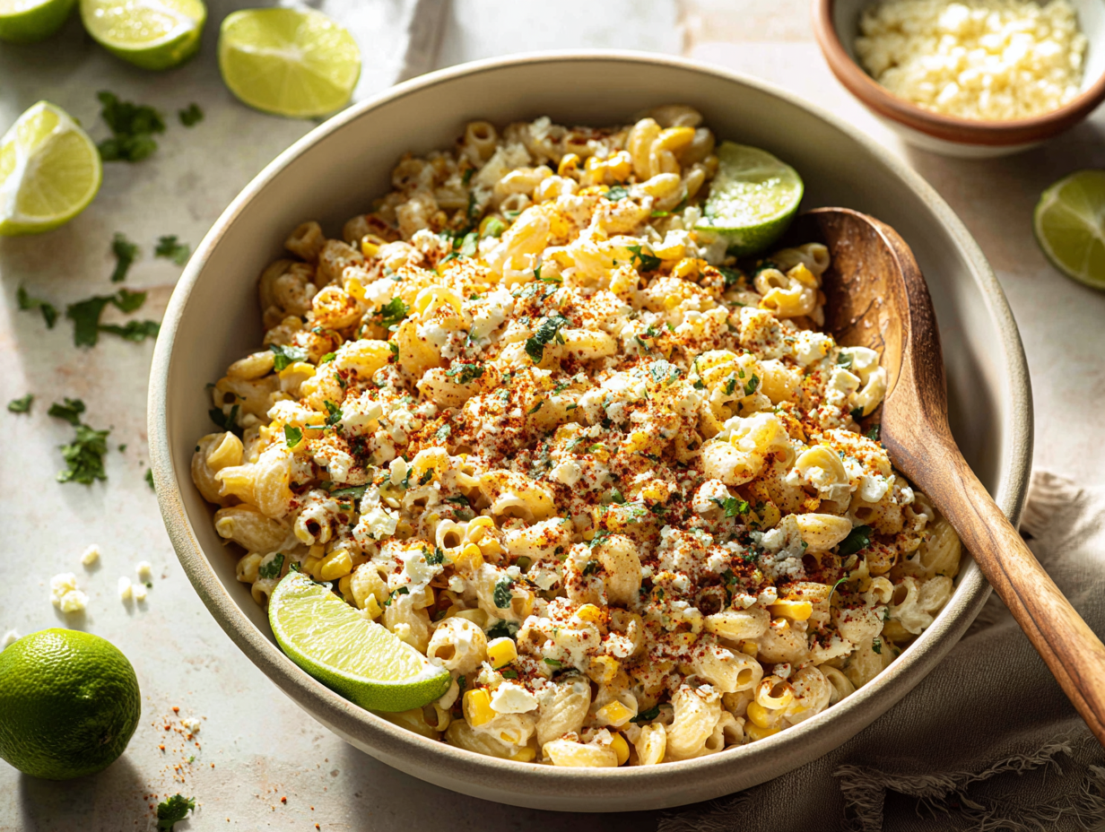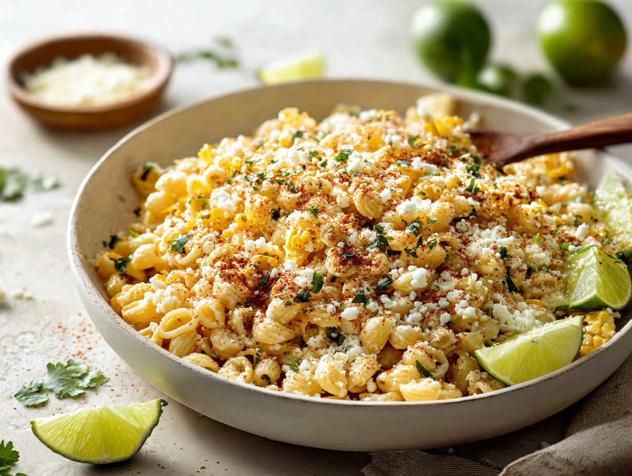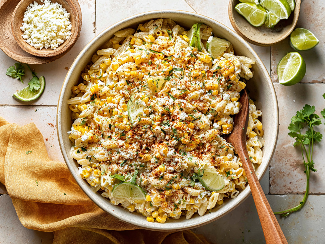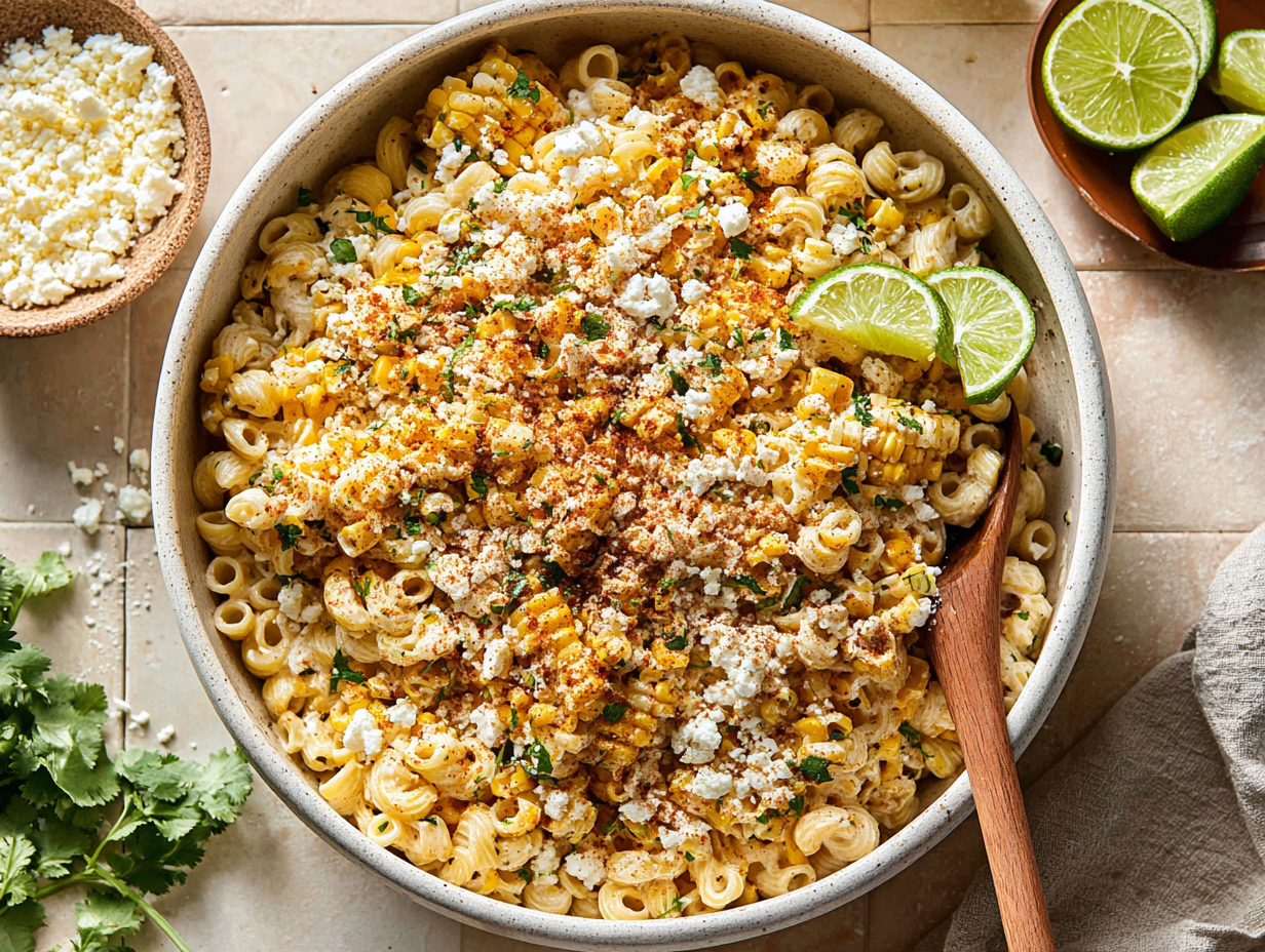 A creamy pasta salad inspired by classic Mexican street corn—sweet corn kernels, tangy lime, a touch of heat, and plenty of cheese all tossed with tender pasta for an easy crowd-pleasing side.