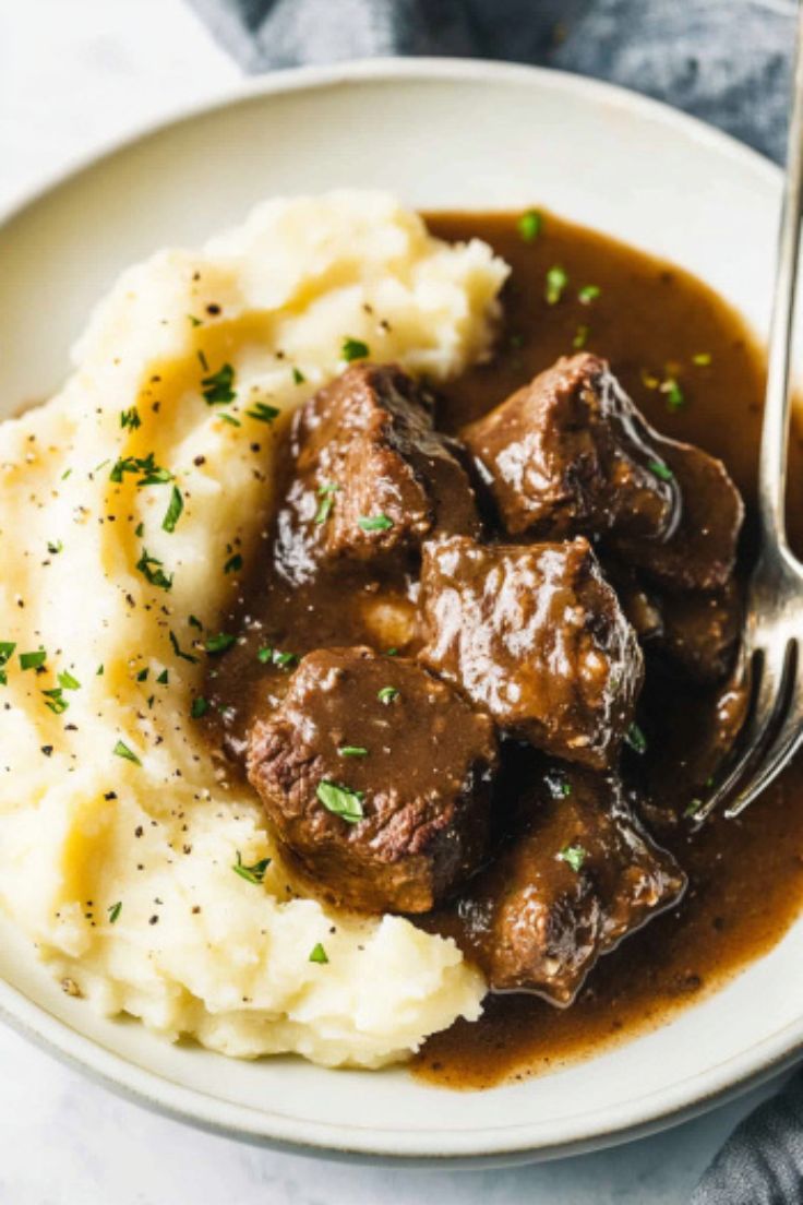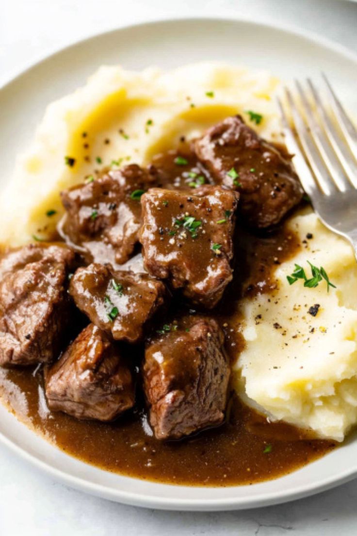 This recipe brings you melt-in-your-mouth beef, simmered until perfectly tender and served over creamy mashed potatoes.