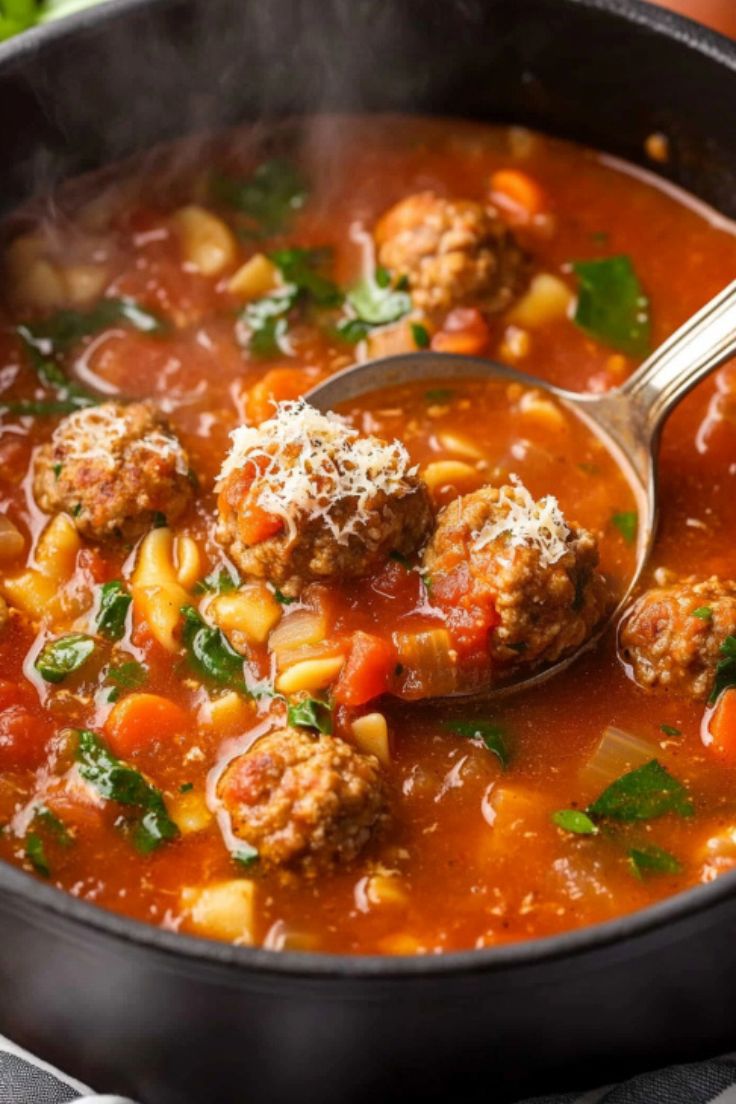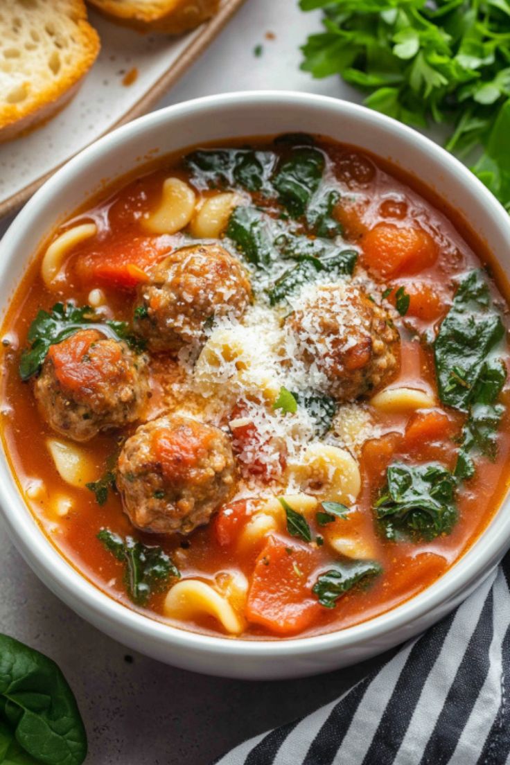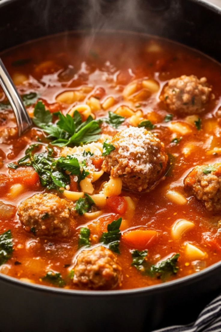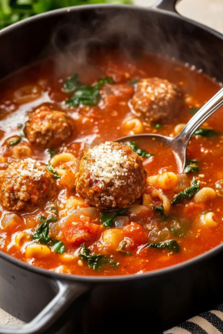 This Italian Meatball Soup is just the thing — packed with tender beef meatballs, veggies, and pasta all simmered in a rich tomato broth.