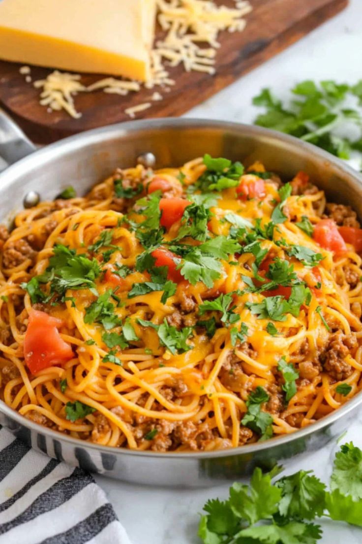 Taco Spaghetti is a fun and flavorful dish that combines two favorite meals: tacos and spaghetti. This easy, one-pan recipe comes together in less than 30 minutes, offering a delicious blend of Italian and Mexican flavors.