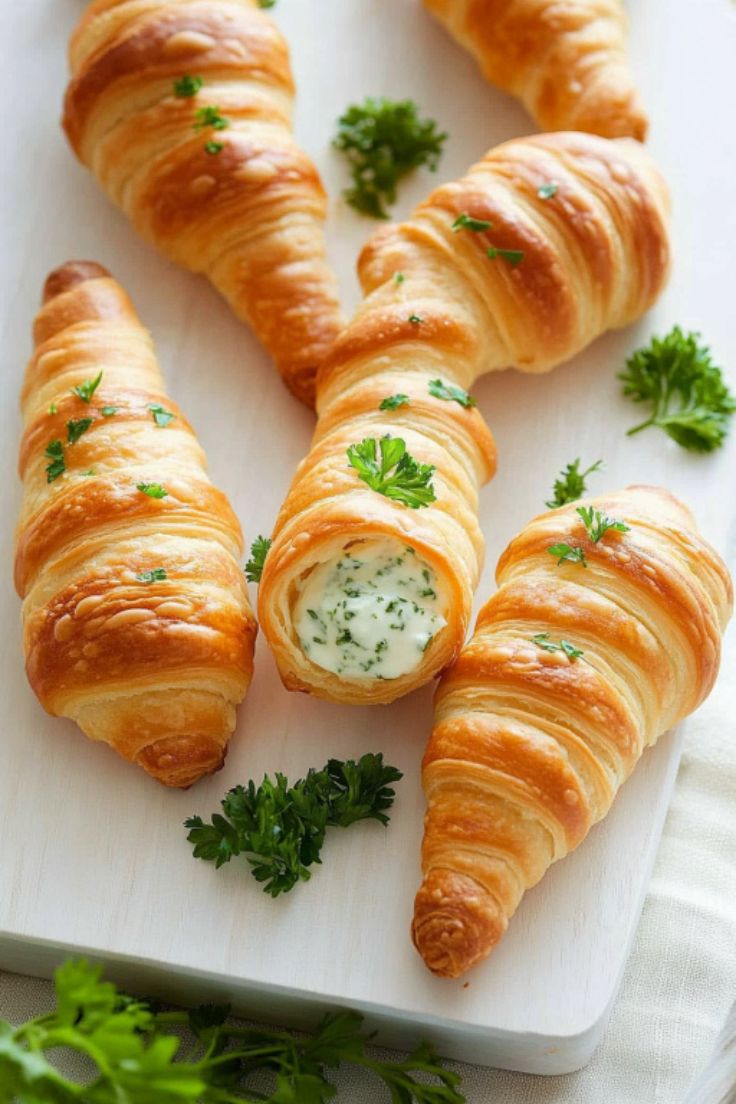 Spoon or pipe the cream cheese filling into each crescent carrot. Garnish each with two sprigs of parsley to resemble the top of a carrot.