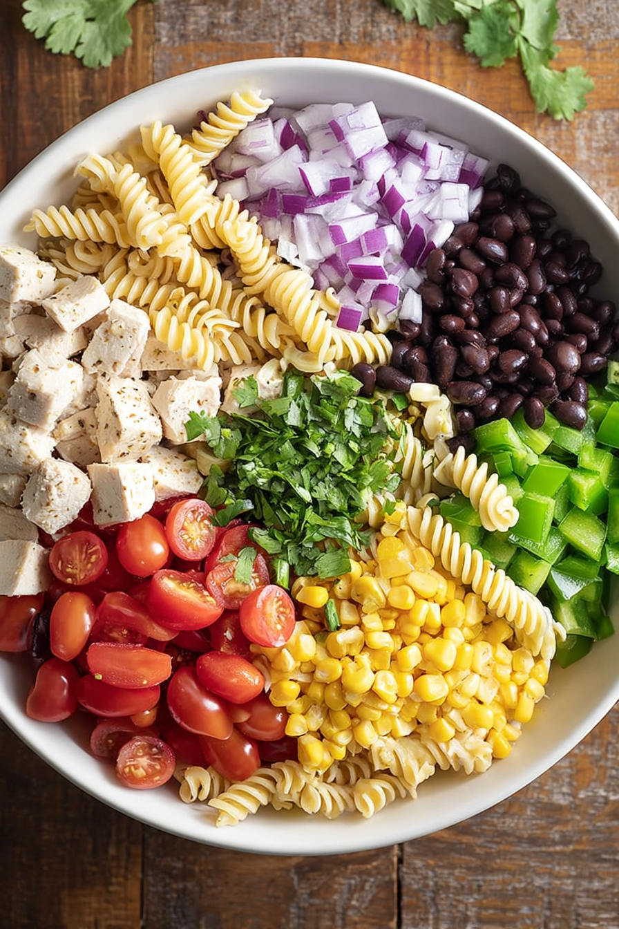 - Add the pasta, black beans, corn, bell pepper, red onion, tomatoes, cilantro, and chicken to a large mixing bowl. Stir until evenly combined.