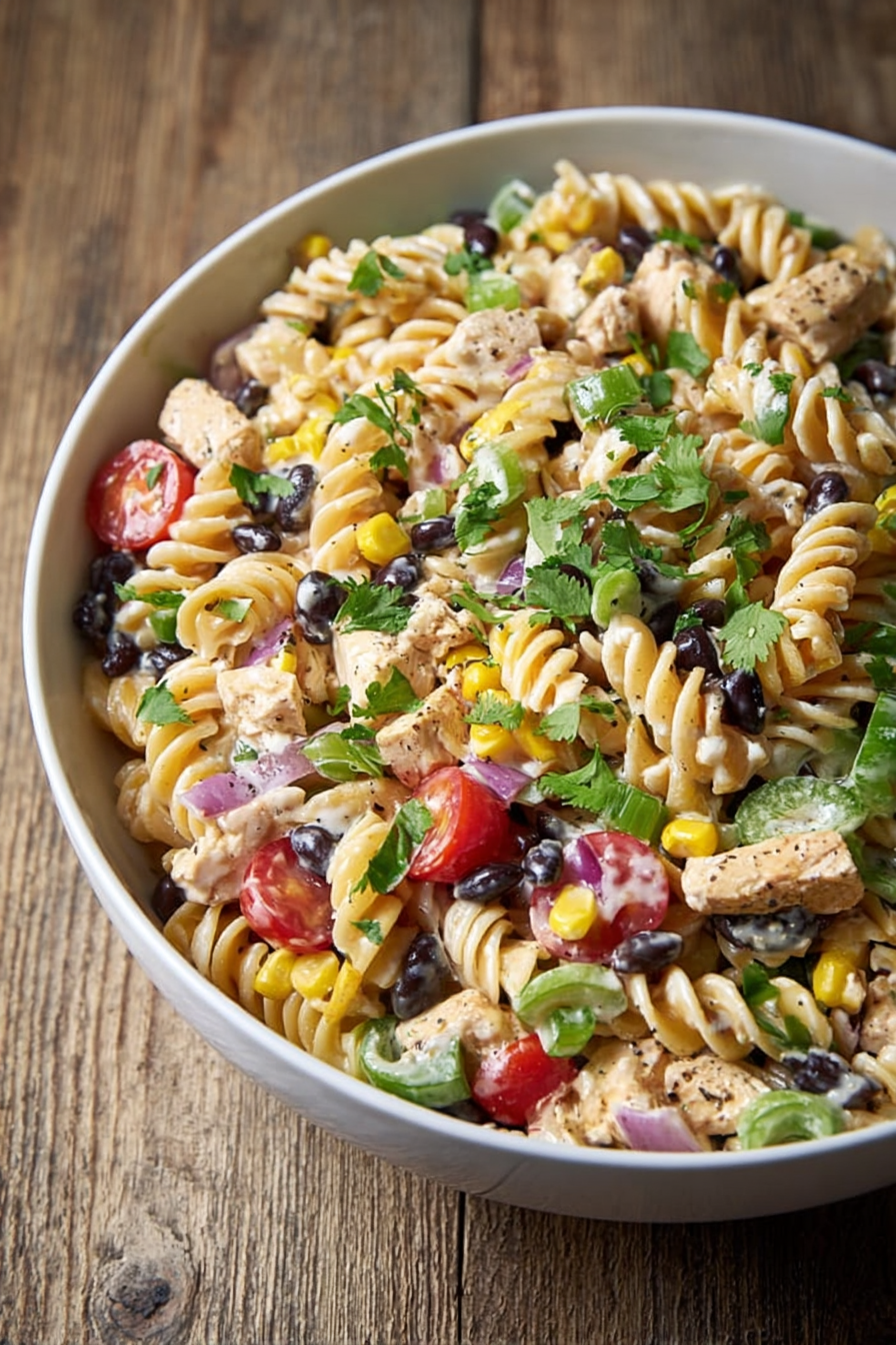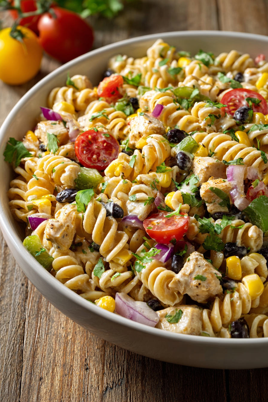 To make this Southwestern pasta salad, you’ll need rotini, black beans, corn, bell pepper, red onion, tomatoes, cilantro, grilled chicken, and chipotle ranch dressing.