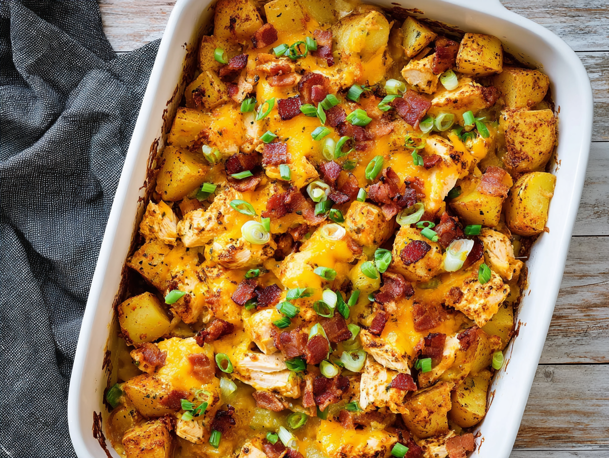 Tender chicken, hearty potatoes, crispy turkey bacon, and melty cheese come together for a comforting, all-in-one meal.