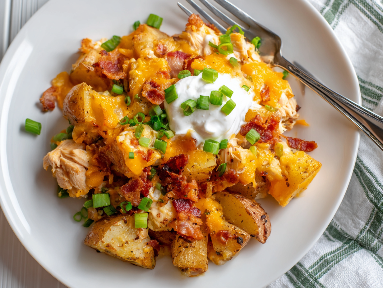 If there’s one dinner that consistently disappears fast in our house, it’s this one. Potatoes roast until golden and crisp at the edges, chicken gets tossed in a simple spice mixture, and then everything is finished with turkey bacon and a blanket of melted cheddar.
